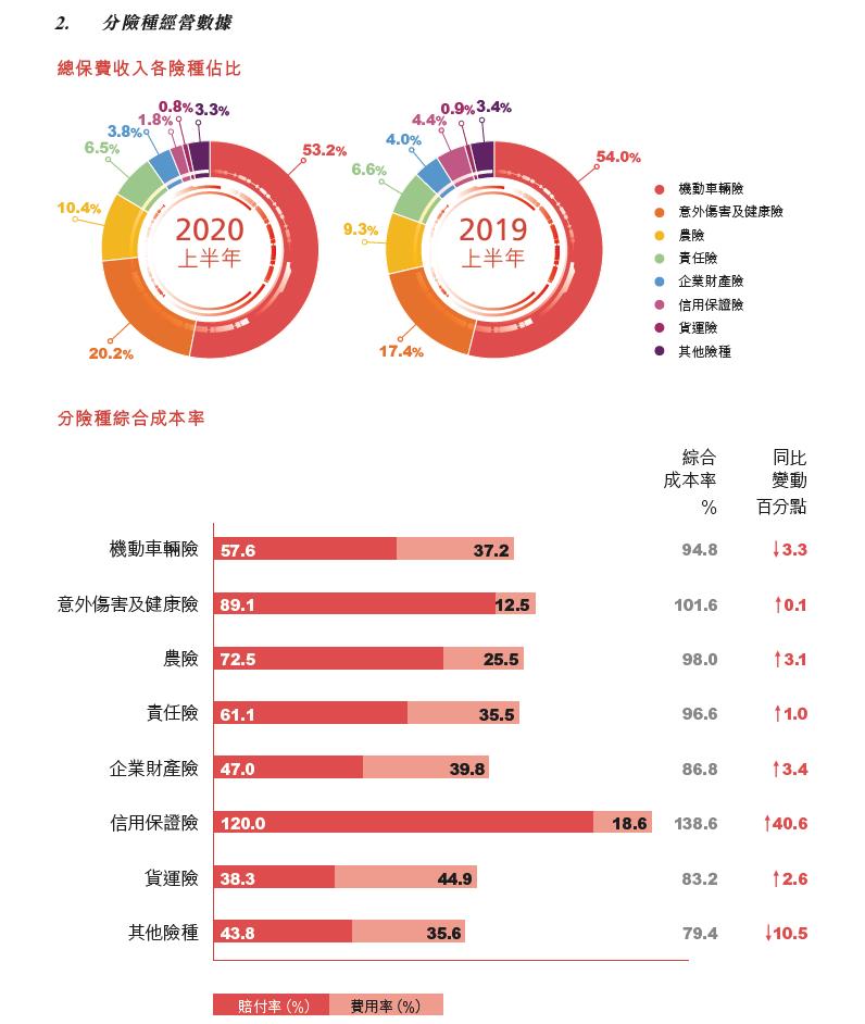 2020年6月當月實現保費收入450.07 億元,同比增長8.7%。2020年上半年,車 險實現保費收入1,310.19億元,業務增速與 市場同步。家庭自用車實現保費收入894.75 億元,佔比達到68.9%,同比提升1.4個百分 點,車險業務結構不斷改善。