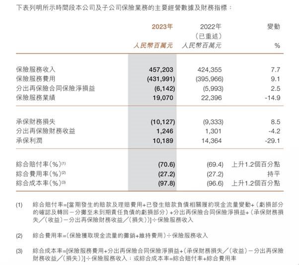 其他險實現保險服務收入283.47億元,同比增長13.5%。其他險綜合賠付率64.5%,同比下降3.4個百分點。由於風險減量服務投入增加以及業務結構調整,其他險綜合費用率31.0%,同比上升2.2個百分點;綜合成本率95.5%,同比下降1.2個百分點;承保利潤12.86億元,同比增長55.3%。